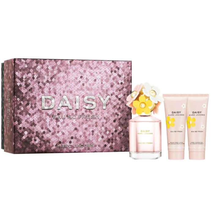Sparkling, bright and elegant. The Marc Jacobs Daisy Eau So Fresh Eau de Toilette gift set is sophisticated but not too serious. A fragrance giftset that excites the senses with a bright elegance and whimsical charm. #MJDaisy The scent's enticing top notes of raspberry and grapefruit sparkle on the skin like sunshine, deepening into a sensuous heart of wild rose and a musky, sophisticated finish of warm plum and cedarwood. Set includes: - Marc Jacobs Daisy Eau So Fresh Eau de Toilette 75ml - Marc Jacobs Daisy Eau So Fresh Body Lotion 75ml - Marc Jacobs Daisy Eau So Fresh Shower Gel 75ml
