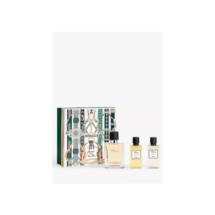 HERMES PARIS TERRE D'HERMES EAU DE TOILETTE FANTAISIE D'ETRIERS GIFT SET Product description Composed of interlacing riding accessories inspired by the equestrian world, the Fantaisie d'Etriers design, by illustrator Virginie Jamin, brings its radiance to this festive gift set. Influenced by joyful creativity, its curves, braids and twists will be the signature of your holiday celebrations. A mineral, woody fragrance, Terre d’Hermès combines the strength of cedar and the radiance of grapefruit with a vibrant touch of flint. Terre d’Hermès narrates the relationship between man and earth, his humble and harmonious dialogue with the elements and nature. Terre d’Hermès is the perfume that connects man to his origins, to the source of his creative power. Set contains: Terre d’Hermès Eau de Toilette, 50ml Terre d’Hermès Hair and Body Shower Gel, 40ml Terre d’Hermès After-Shave Lotion, 40ml