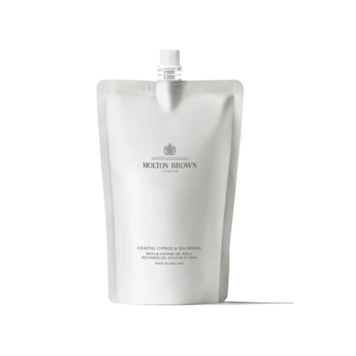 MOLTON BROWN COASTAL CYPRESS & SEA FENNEL BATH & SHOWER GEL REFILL 400ml A treat for you and the planet – discover our iconic, aromatic body wash in a waste-reducing Refill. Replenish your plastic or Infinite Bottle with bracing cypress, marine notes and spicy, unexpected cardamom for a more earth-kind, luxurious cleansing experience. Indulge in a refreshing cleansing experience with the Molton Brown Coastal Cypress and Sea Fennel Bath and Shower Gel Refill. The award-winning formula swiftly removes impurities and build-up, helping to leave the skin feeling invigorated. Suitable for all skin types, the body wash features an uplifting fragrance inspired by where the sea and earth combine. Salty marine notes mingle with bracing blue cypress, juxtaposing against spicy nuances of cardamom for an exhilarating finish. HOW TO USE Application: Decant the body wash refill into your plastic or reusable bottle. Apply the indulgent body wash in your bath or morning shower for a bracing ritual The Fragrance A salt-sprayed collision of the ocean swell against rugged outcrops. The shore air fresh with crisp fig leaves mingled with unexpected, punchy cardamom, joyful bergamot and marine notes. Bracing cypress, cedarwood and musks bring natural, earthy appeal. Explore on the edge; awash your senses with a sea-soaked quest. Coastal. Bracing. Intrepid.